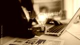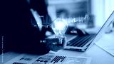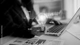 A business person holds a light bulb symbolizing innovation while analyzing financial data on a laptop. Charts illustrate growth and investment opportunities in a modern office. Scalp
