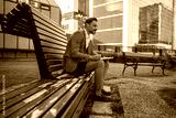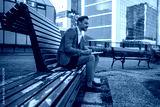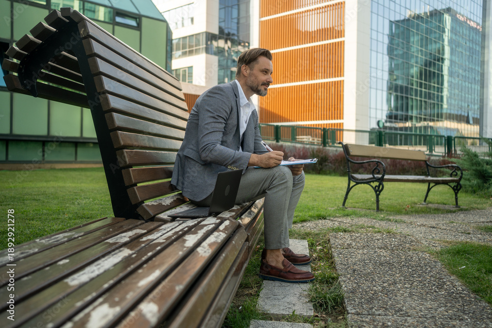 Businessman writing new ideas on bench outdoors, inspired and creative