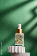 Transparent cosmetic serum bottle with golden cap and dropper placed on white geometric pedestal against soft green background. Minimalist skincare concept with elegant natural lighting.