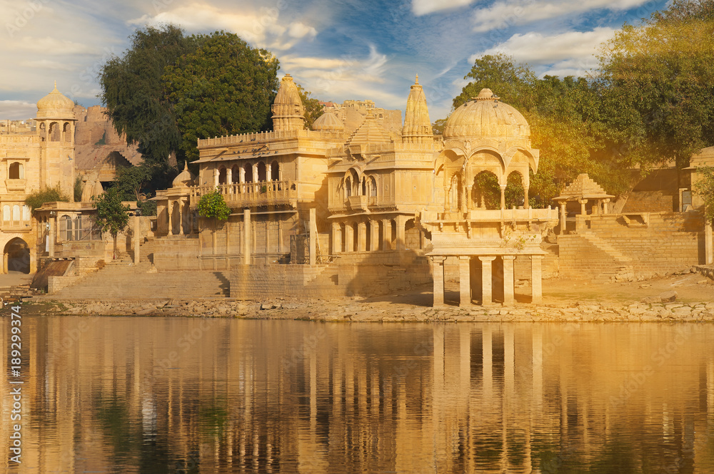 Gadi Sagar temple on Gadisar lake Jaisalmer, India.