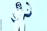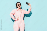 Young beautiful smiling female in trendy summer pink overalls. Sexy carefree woman posing near blue wall in studio with two horns. Positive model having fun and going crazy. Taking selfie photos