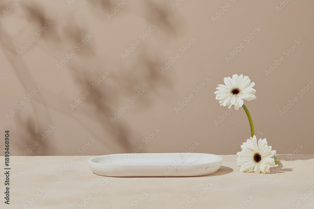 Minimal scene with a white ceramic podium and single daisy flower on a beige pastel background