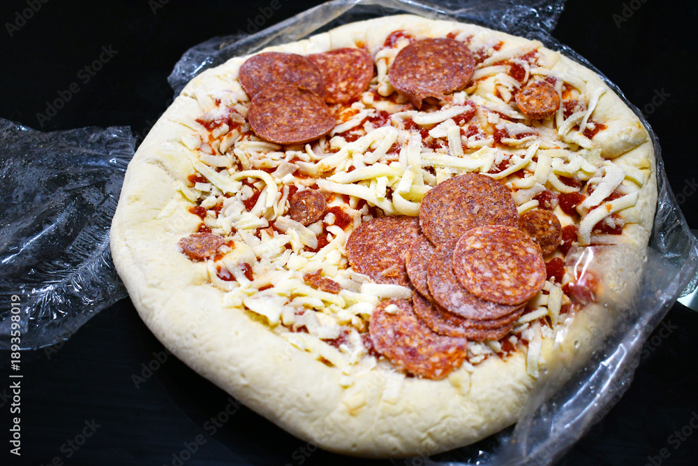 Frozen pepperoni pizza with mozzarella cheese on plastic wrap.