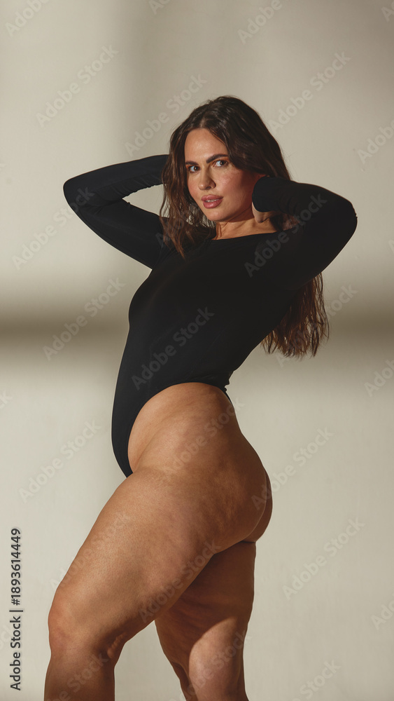 Curvy woman embracing body confidence in black bodysuit in studio. Concept of modern bodysuit styling, inclusive fashion trends, selfcare promos and brand identity visuals.