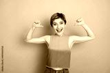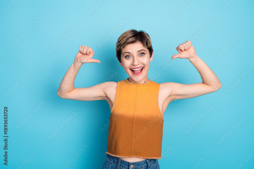 Confident young woman in casual chic orange top poses with arms raised smiling against blue background for fashion lifestyle advertising and shopping promotion sale