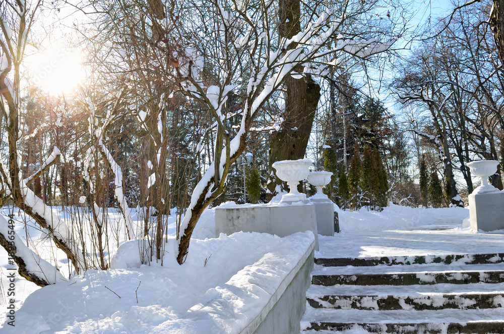 Sun rays among the trees in the park in winter
