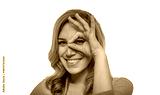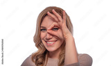 A cheerful blonde woman in a sparkling dress smiles broadly while making an OK hand gesture over her eye against a white background.
