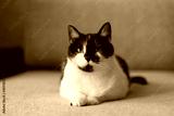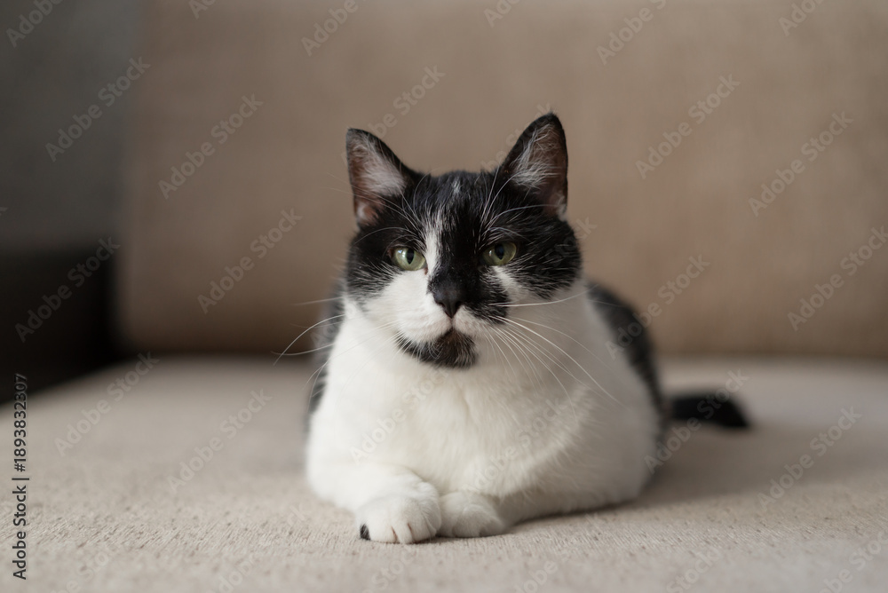 A black and white cat is lying comfortably on a couch, enjoying a peaceful moment in its cozy home environment.