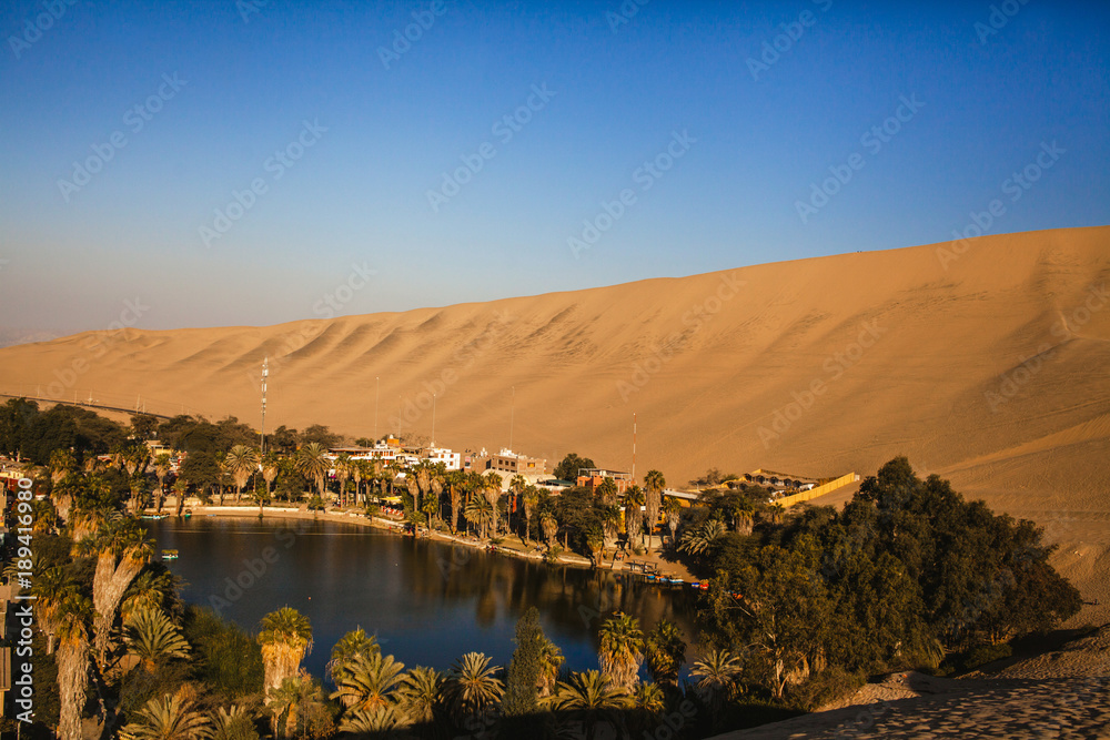 Huacachina Oasis, in the desert sand of Ica, Peru.