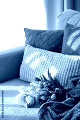 Tulip Bouquet and Gift Box on Cozy Sofa. Warm Spring Stylelife with Sunlight