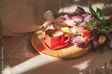 Heart Shaped Coffee Cup with Tulips on Bed. Romantic Valentines Day Celebration