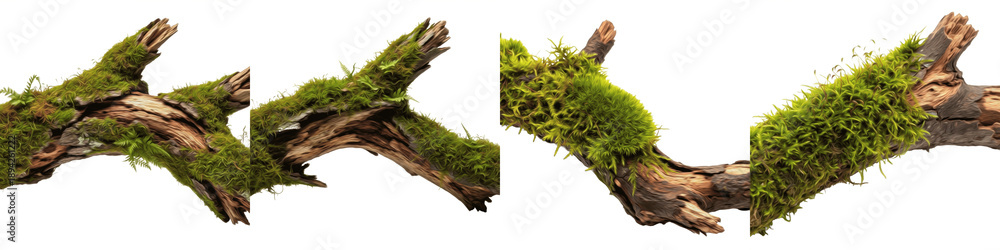Set of Four Realistic Mossy Tree Branches, Natural Forest Wood Pieces with Green Moss, 3D Rendered Woodland Landscape Elements, Isolated on White Background PNG