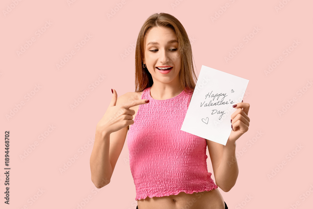 Beautiful young woman pointing at greeting with text HAPPY VALENTINE'S DAY on pink background