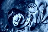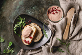 Chicken homemade liver paste or pate in glass jar with sliced whole grain bread, wood knife, cranberries, green salad served on ceramic plate with textile over dark metal background. Top view, space