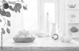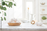 Eggs, flour, jug of milk and oil for preparing dough on table in rustic kitchen interior background