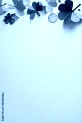 A vertical festive St Patrick's Day scene featuring shamrocks, green tones, and scattered coins for greeting cards and banners