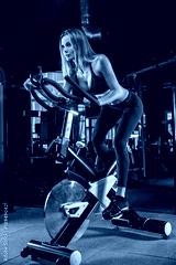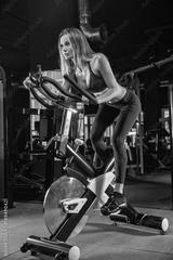 Young beautiful blonde girl doing exercises on an exercise bike in a modern gym, in beautiful sportswear. On a dark background.