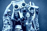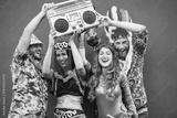 Happy dressed people celebrating at carnival party - Young friends having fun together at fest event - Hangout, festive and happiness concept - Focus on faces