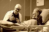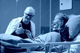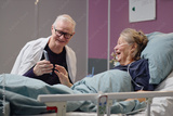 Senior Caucasian man showing smartphone to senior Caucasian woman lying in hospital bed, both smiling and interacting, medical setting indicating vascular center patient care scenario