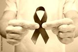 Man holding blue ribbon on color background, closeup. Prostate cancer awareness