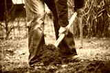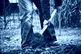 Gardener digging in a garden with a spade. Man using a big shovel for digging old lawn. Soil preparing for planting in spring. Hands in motion.