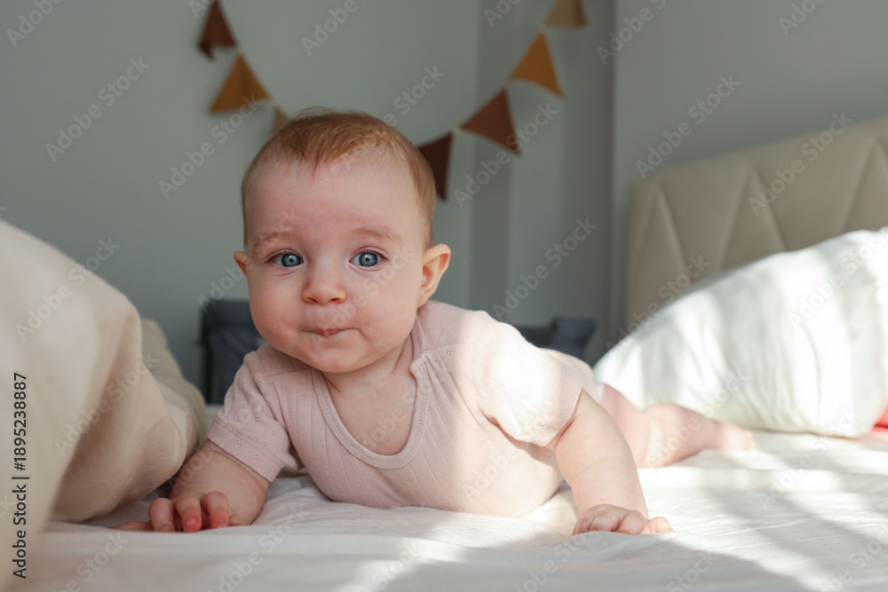 Playful baby on the bed. Copy space, background.Copy space, background.