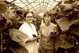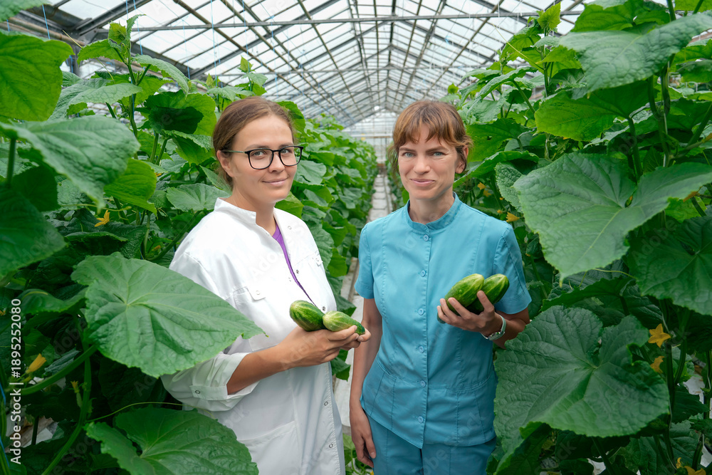 Two women workers smile while holding freshly harvested green cucumbers. They stand between tall rows of lush cucumber plants within a large, modern greenhouse, showcasing a successful cultivation.