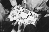 A diverse marketing team collaborates, holding puzzle pieces with symbols of technology, media, and advertising, representing modern digital strategies and team synergy. Amity