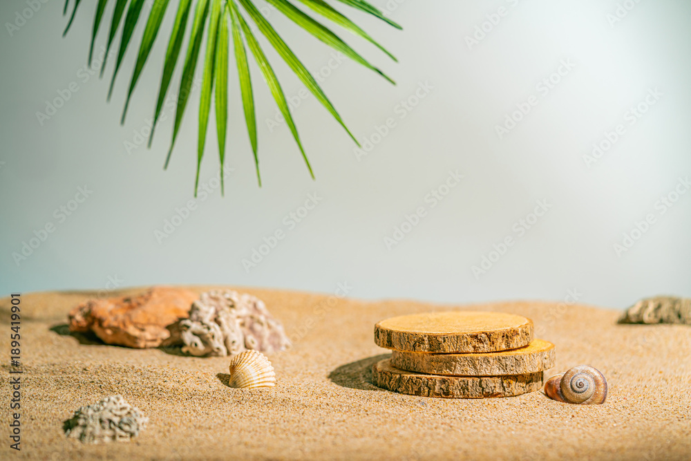 Natural product display scene with wood podiums on beach sand, palm leaf shadow, and seashells. Ideal for eco skincare mockups, organic cosmetics branding, or summer wellness visuals