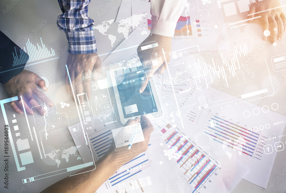 business documents on office table with smart phone and digital tablet and graph financial with social network diagra