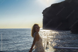 Woman traveling by boat at sunset among the islands. Summer Sntorini, Greece