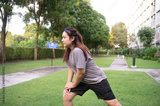 A person in athletic wear performs a lunge stretch in a green park with trees and a pathway in the background.