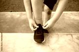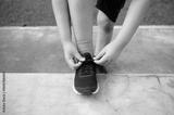 A person in black shorts and gray socks sits on a concrete ledge, tying the laces of a black athletic shoe with grass in the background.