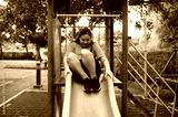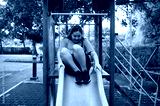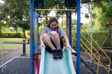 A person in casual clothing sits on a slide at a playground, smiling joyfully amidst lush greenery and playground equipment.