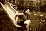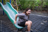A young woman sits on a green playground slide, laughing amidst lush greenery and rubber ground tiles.