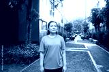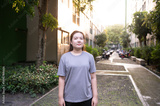 A young woman in a gray shirt smiles softly outdoors, surrounded by greenery and buildings, with a sunlit pathway leading into the distance.