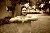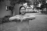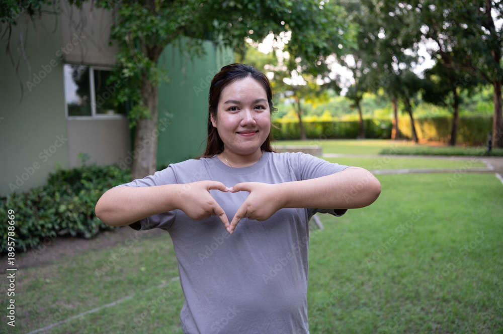 A young woman outdoors smiles gently while shaping a heart with her hands against a backdrop of greenery and a building.