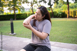 A young woman in a gray shirt sits on a park bench, cradling her elbow in discomfort amidst a backdrop of green grass and sunlit trees.