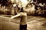 A person stands with arms outstretched in a park, surrounded by a colorful playground and lush greenery.
