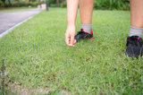 A hand reaches down to pick something up from lush green grass while standing on a pathway in black shoes and grey socks.