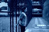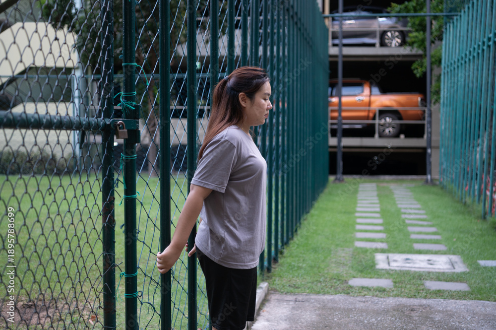 A woman stands by a green fence gate, with parked vehicles visible behind a parking structure.