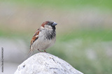 House sparrow on a rock. Sparrows are accustomed to the urban environment