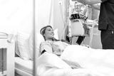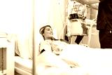 Patient in hospital bed. Female patient smiling in clinic, healthcare and medicine concept. Young woman lying in a medical ward while doctor or male nurse works with equipment in the background.