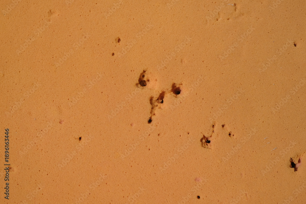 Abstract texture background of an old orange sponge mattress surface with holes. For graphic design, 3D rendering and banners