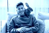 Happy man with cute bunny on sofa at home