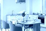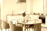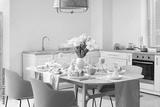 Modern interior of stylish kitchen with Easter table setting, counters and vase of flowers