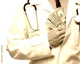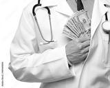 Doctor putting money in pocket on white background, closeup. Corruption concept