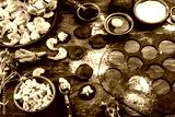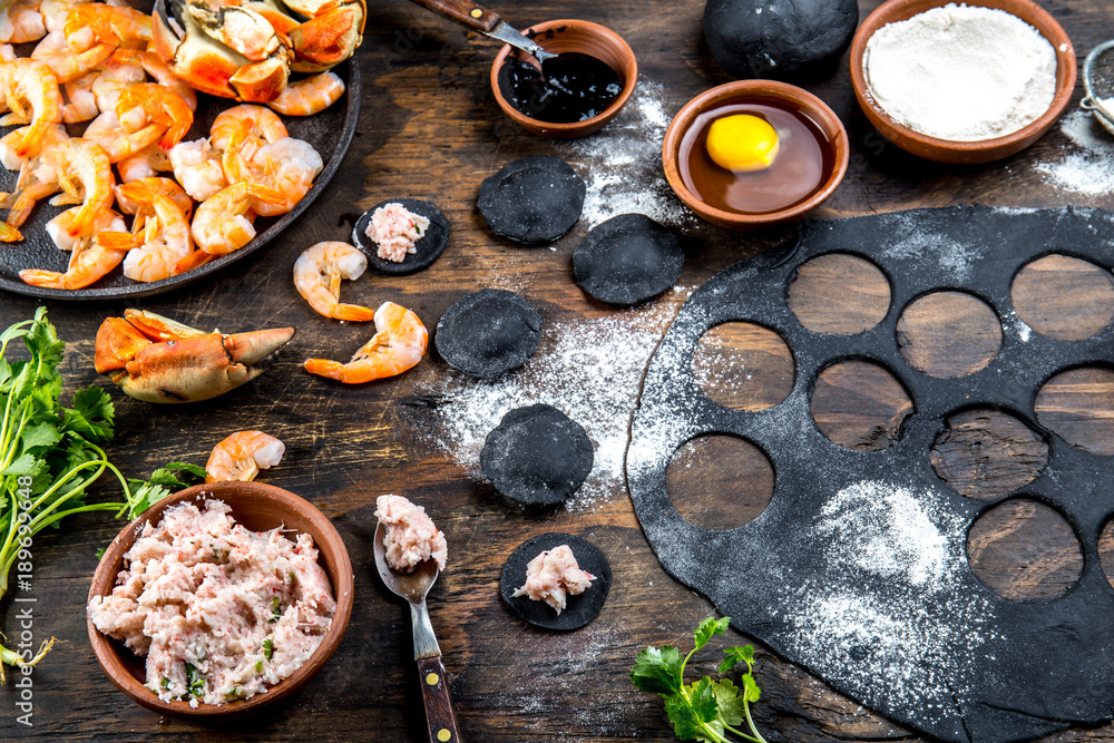 Preparation of Italian black ravioli with seafood shrimps and crabs on black plate, gray stone slate background. Top view