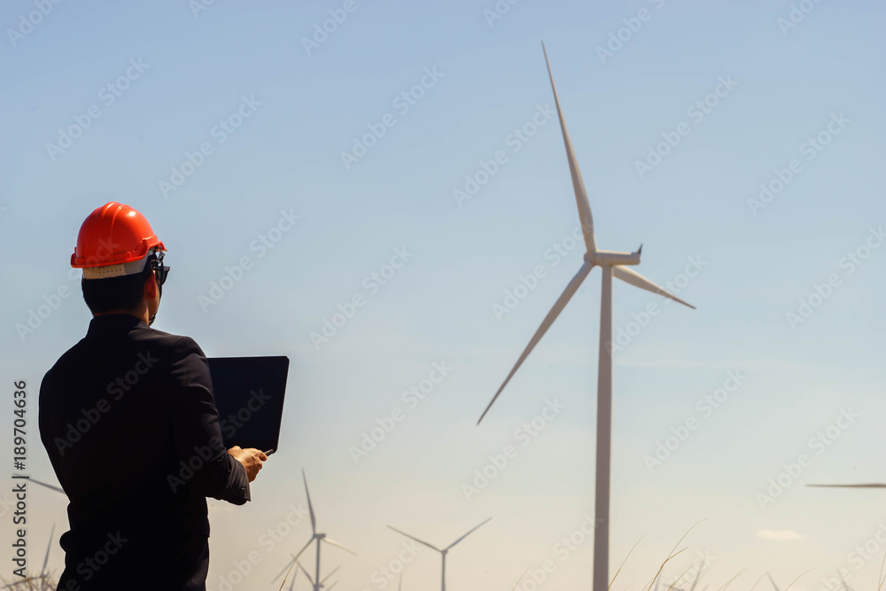 Portrait of engineer asian man holding tablet with the wind turbine in background.