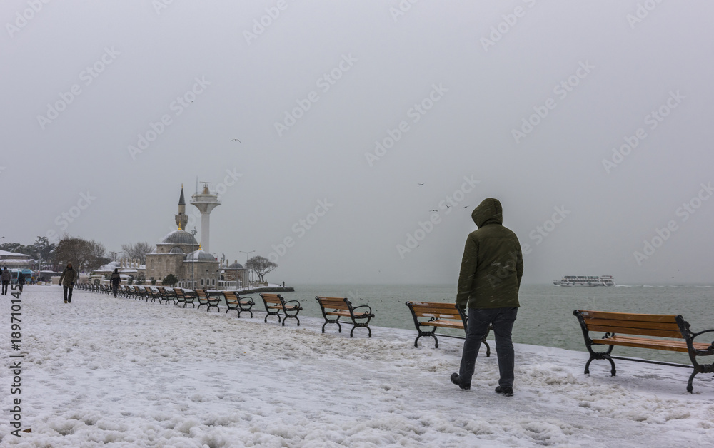 Snowy day in Istanbul, Turkey. Peoples walking on snow. .